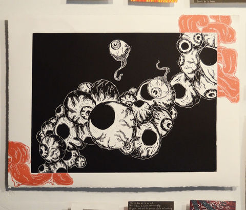 “How to be Human” is the printmaking thesis that Lyz completed over the course of their last year of undergraduate work towards receiving their BFA from the University of Michigan Stamps School of Art and Design. It is composed of relief, lithograph, and intaglio prints. GUTS is the name of the group show in which this project was exhibited, put on with Justin Hein, Taylor Bultema, Alex Kaufman, and Ronan Lynam at the Yellow Barn in Ann Arbor. Press and promotion for the show, as well as the preparation of the space were handled by the artists.